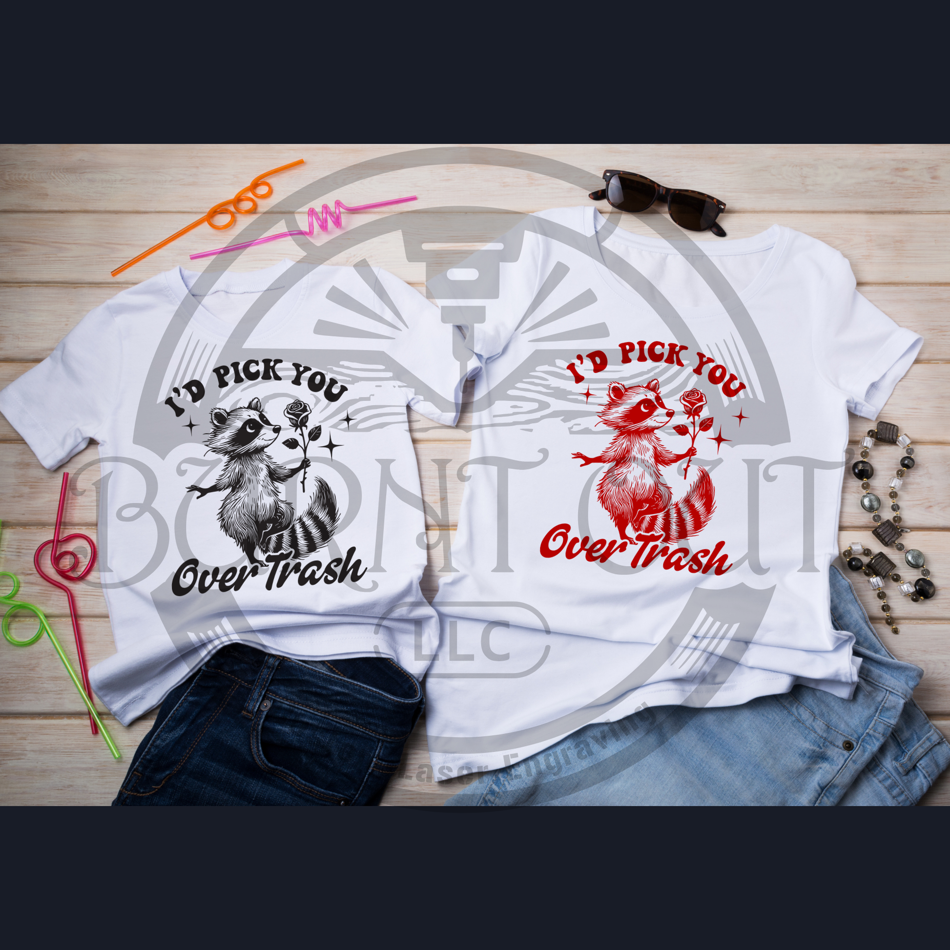 Buy just the DTF transfer and press it on a shirt yourself, or buy it as a completed item pressed and ready to wear.